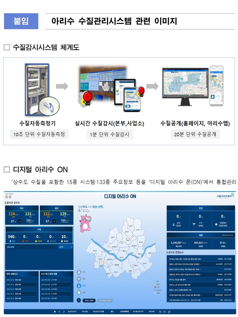 이회승 서울아리수본부장은 “서울시민이 안심하고 수돗물을 마실 수 있도록 수질 감시망을 더욱 정밀하게 구축하고 있다”며 “앞으로도 정체수 자동배출장치 확대 설치 등 수질 관리 인프라를 지속적으로 강화해 깨끗하고 안전한 아리수 공급에 만전을 기하겠다”고 밝혔다.
