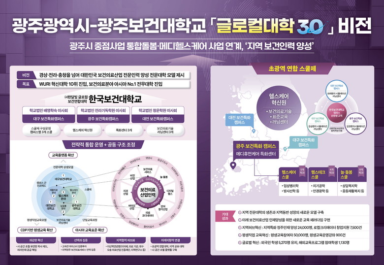 이번 선정으로 광주‧대구‧대전보건대학은 5년 간 국비 1000억원의 예산을 지원받아 한국보건대학교라는 단일거버넌스 아래 3개 지역에 각각 특화캠퍼스를 구축하고, 스쿨제로 교육과정을 개편해 초광역 보건의료산업 전문대학의 새로운 모델을 실현할 계획이다.