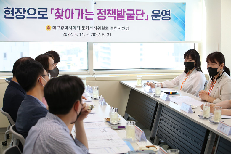 ‘찾아가는 정책발굴단’은 올해부터 대구시의회에 도입된 정책지원인력(정책지원팀)을 활용해 처음 실시하는 제도이다. 정책발굴단은 고충과 애로사항을 직접 표출하는데 어려움이 있는 시 산하 출연기관 및 원거리 근무자와의 소통을 강화하여 현장의 운영상황을 의회의 관점에서 살펴보고, 다양한 현장의 소리를 들어 대화 문화 정착 및 공감 정책을 실현하고 나아가 먼저 다가가는 열린 의정활동을 구현하고자 계획되었다.