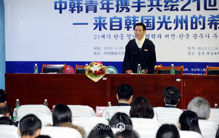 [광주=세계타임즈 손권일 기자]윤장현 광주광역시장이 지난 18일 오전 중국 후난대로부터 명예교수로 위촉된데 이어 학계 원로 및 학생 등 300여 명을 대상으로 '21세 한·중 청년의 고동비전'이라는 주제의 특강을 했다.
