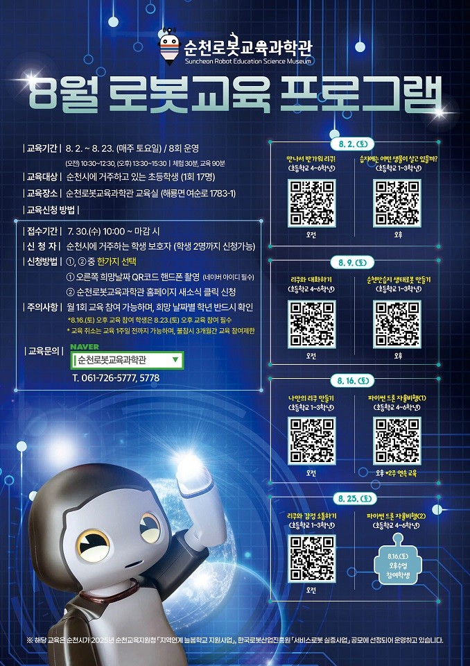 이번 8월달 교육은 순천시와 순천로봇교육과학관 홈페이지(https://scrobot.kr) 에서 확인가능하며 7월 30일 10시부터 온라인으로 신청할 수 있다.