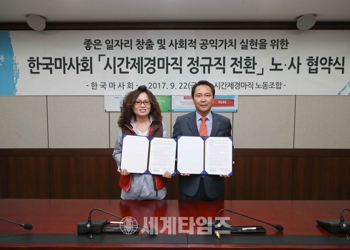 [세계타임즈 신민정 기자]한국마사회(회장 이양호)는 9월 22일(금) 좋은 일자리 창출 및 사회적 공익가치 실현을 위한「시간제경마직 정규직 전환 노·사 협약식」을 개최했다.