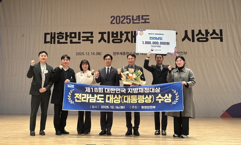 [전남 세계타임즈=우덕현 기자] 전라남도는 16일 정부세종청사에서 열린 행정안전부의 2025년 제18회 대한민국 지방재정대상 시상식에서 ‘통합재정운영평가’ 분야 대상(대통령상)을 받아, 재정인센티브 10억 원을 확보했다고 밝혔다.