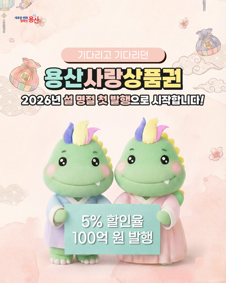 100억 원 규모의 ‘용산사랑상품권’은 오는 2월 5일 오전 9시 ‘서울페이플러스(서울pay+)’ 앱에서 판매된다. 용산구 내 서울페이 가맹점에서 사용 가능하며, 5% 할인율이 적용된다. 1인당 월 구매 한도는 50만 원, 보유 한도는 150만 원이다.