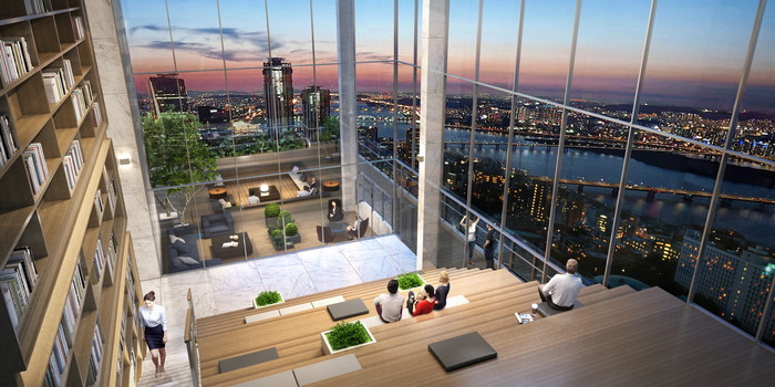 단지의 자부심이 될 스카이커뮤니티에는 한강과 도심을 내려다 보며 사색을 즐길 수 있는 도서관을 설치하고, 외부에 설치된 선셋 테라스와 연계하여 야외 영화 상영 등 다양한 이벤트 진행이 가능한 공간으로 만들 계획임. 또한 33층에 위치한 게스트 스위트는 귀한 손님을 초대하거나 가족들의 특별한 시간을 만들기 위해 마련했다.