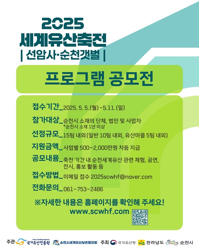 프로그램 공모에 대한 상세한 내용은 2025 세계유산축전-선암사, 순천갯벌 누리집(www.scwhf.com)에서 확인할 수 있으며, 순천시 세계유산보존협의회 사무국(061-749-2486)으로 문의하면 된다.