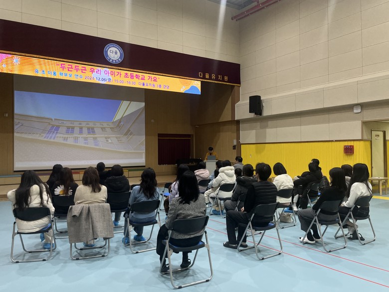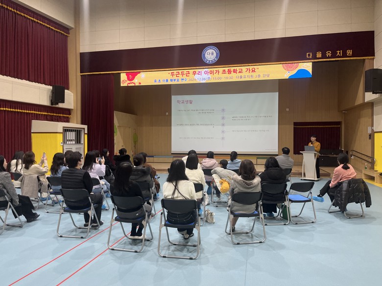 다율유치원(원장 박경숙)은 “이번 연수를 통해 초등학교 입학 예정인 학부모들에게는 유아의 바람직한 성장과 발달을 돕는 좋은 기회가 되었고, 유치원과 초등학교 교사 간 학습 지도에 대한 정보 교류와 교육의 연속성을 유지할 수 있는 또 다른 기회가 되었을 것이다.”라고 말하였다.