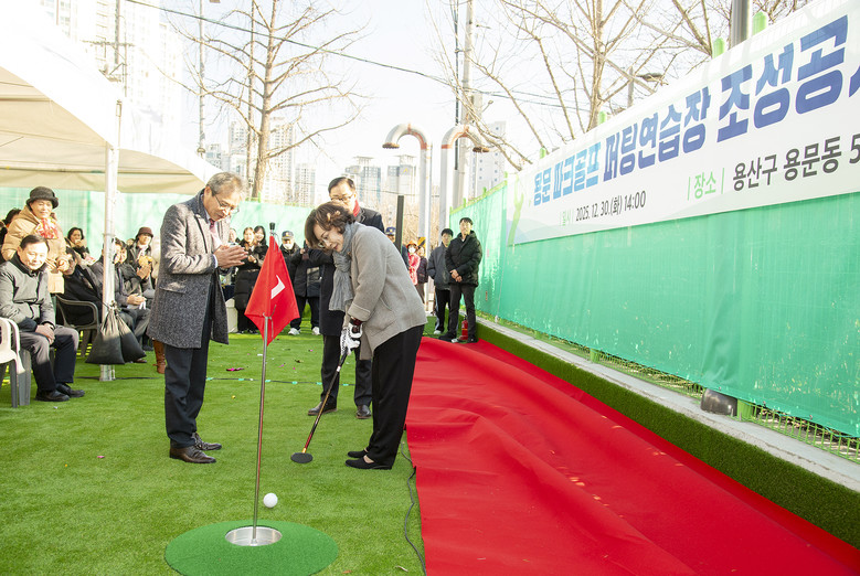 | ▲ 지난 12월 용문 파크골프 퍼팅연습장 준공식에 참석한 박희영 용산구청장이 시타를 하고 있다 |