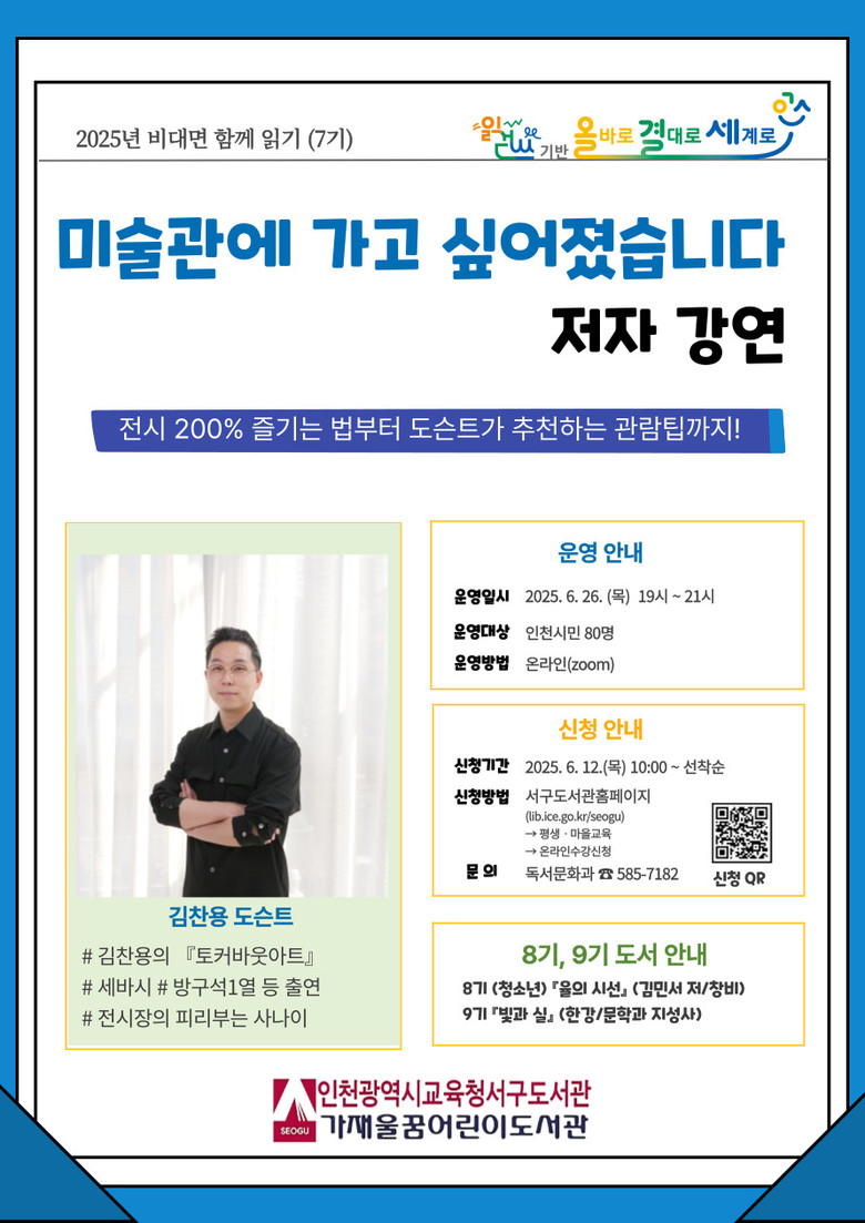 강연은 지역 주민 누구나 참여할 수 있으며, 6월 12일(목) 오전 10시부터 서구도서관 누리집(평생·마을교육 → 온라인 수강신청)에서 선착순 신청을 받는다.