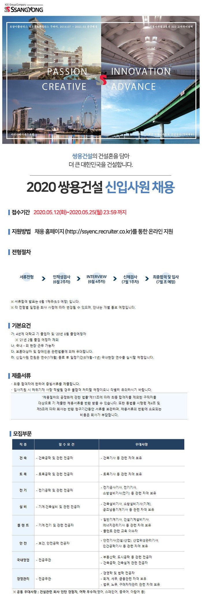 쌍용건설 2020년 신입사원 공개채용