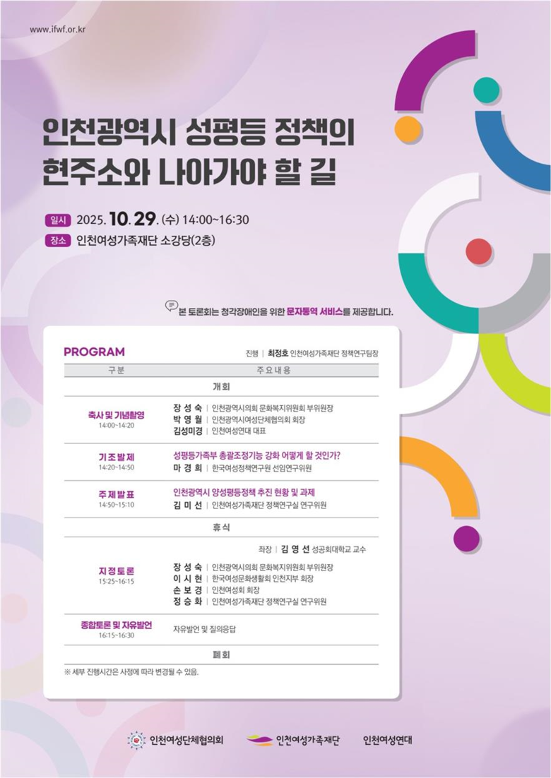 인천여성가족재단은 이번 토론회를 통해 전문가와 시민이 함께 의견을 나누는 공론의 장을 조성하고, 성평등 담론이 지역사회 전반으로 확산될 수 있는 기반을 마련하고자 한다. 특히 정보 접근이 어려운 시민을 배려하기 위해 청각장애인을 위한 문자통역 서비스를 제공, 포용적 행사로 운영할 계획이다.