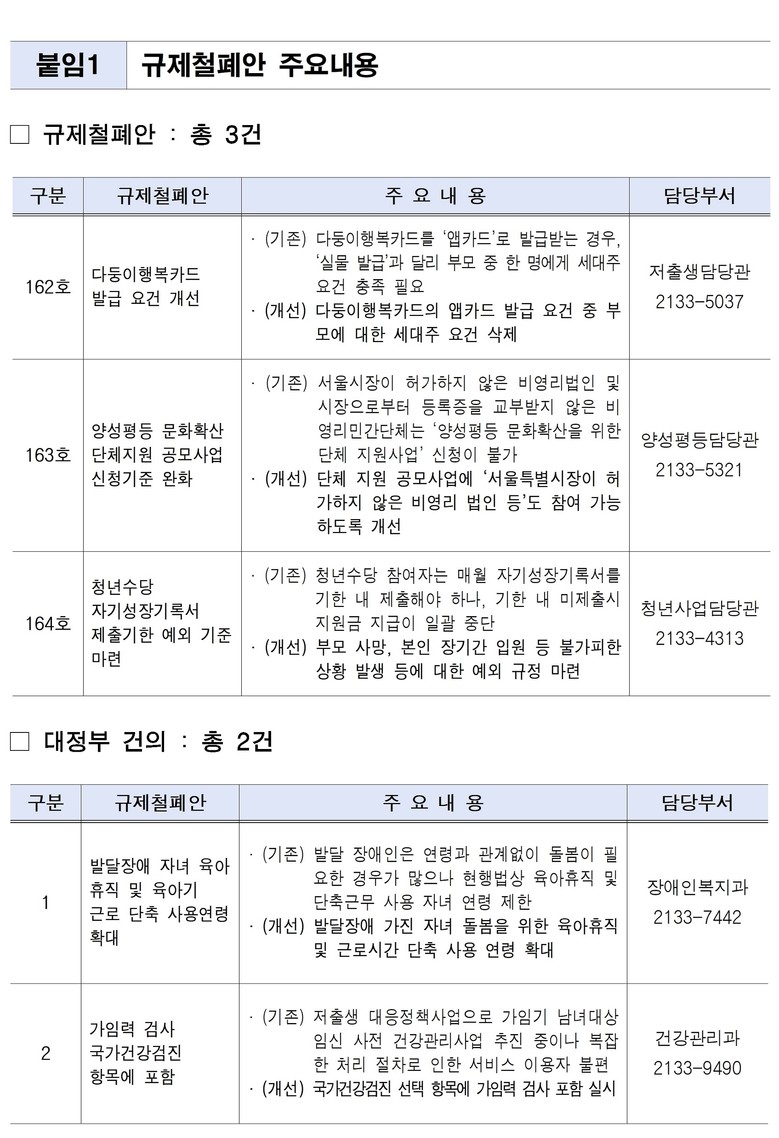 한편 서울시 자체 규제 개선만으로 해결이 어려운 가족.돌봄 분야 제도적 한계를 보완하기 위해 시는 법령 개정이 필요한 개선 과제 2건을 29일(목) 국무조정실에 건의했다.
