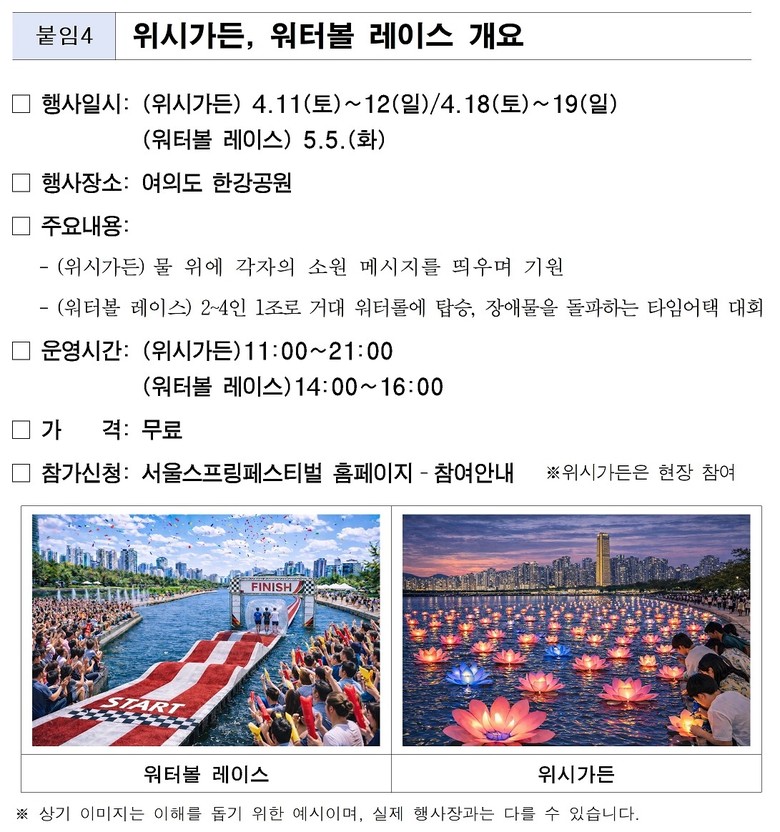 여의도 한강공원 물빛광장 특설무대에서는 시민들이 거대한 볼을 굴리며 장애물을 돌파하는 ‘워터볼 레이스’과 물 위에 소원을 적어 띄우는 ‘위시가든’ 등 특별한 체험형 프로그램 운영된다. ‘워터볼 레이스’는 공식 누리집에서 4. 1.(수)부터 누구나 자유롭게 참가 신청을 할 수 있으며, ‘위시가든’은 현장에서 참여 가능하다.