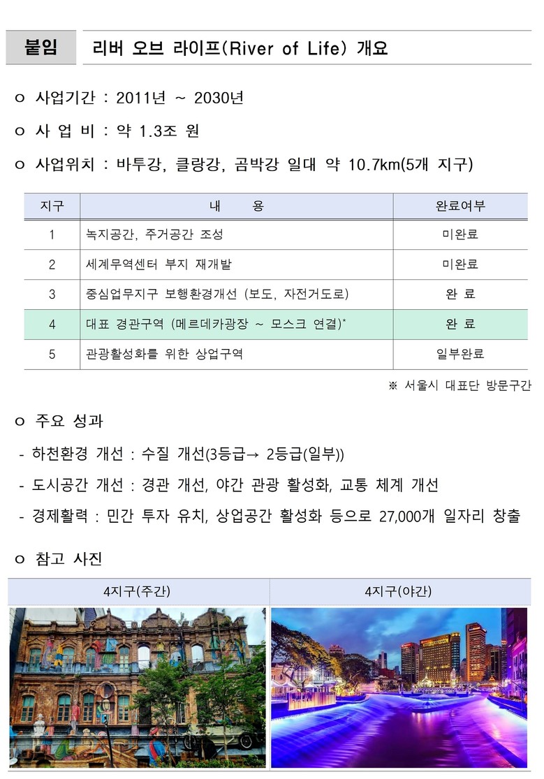 ‘리버 오브 라이프’는 2011년부터 약 10년간 총 10.7km 구간에서 수질.하천 환경 개선, 보행 동선 정비, 역사.경관 복원, 야간경관 특화 등을 복합적으로 추진해 침체된 하천 일대를 체류형 관광.상권 중심지로 탈바꿈시킨 프로젝트다.