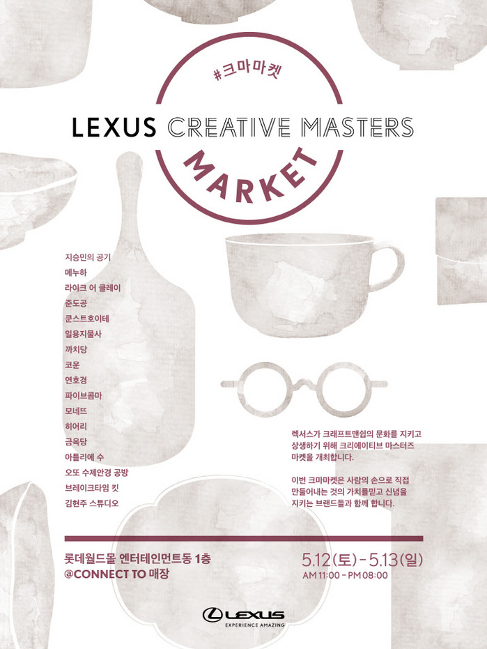 [세계타임즈 이영진 기자] 렉서스 코리아는 5월 12일, 13일 양일간 잠실 롯데월드몰에 위치한 한국 토요타 자동차의 복합문화공간 커넥트 투(Connect To)에서 ‘크리에이티브 마스터즈 마켓’을 연다.
