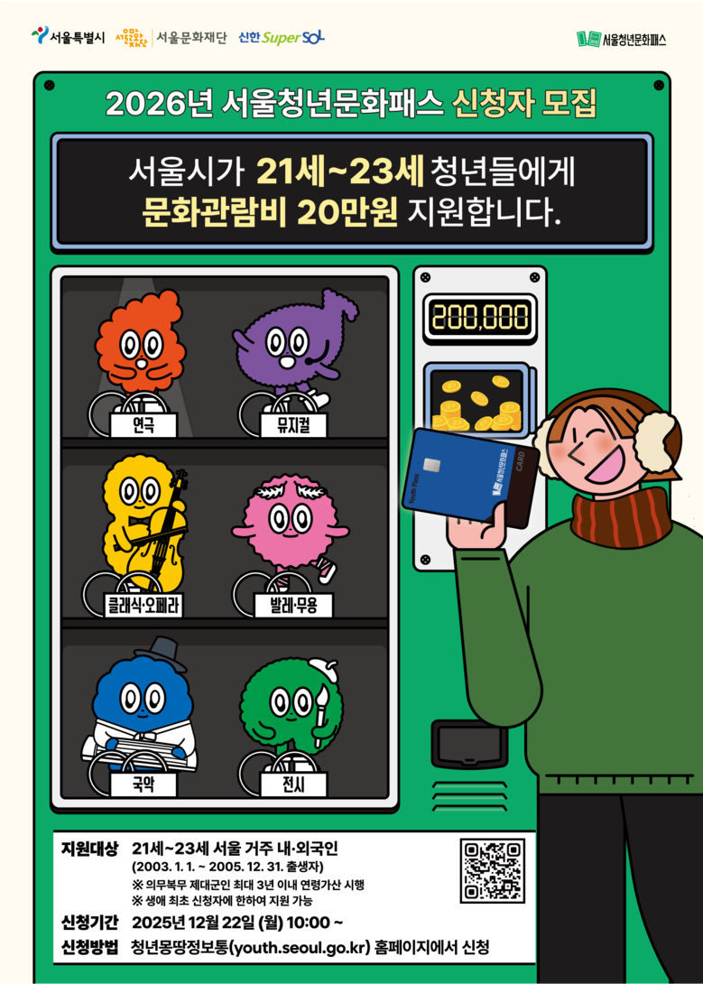 2026년 서울청년문화패스는 2003년~2005년에 태어난 서울 거주 청년 중 가구 기준 중위소득 150% 이하인 청년이 혜택을 받을 수 있다.