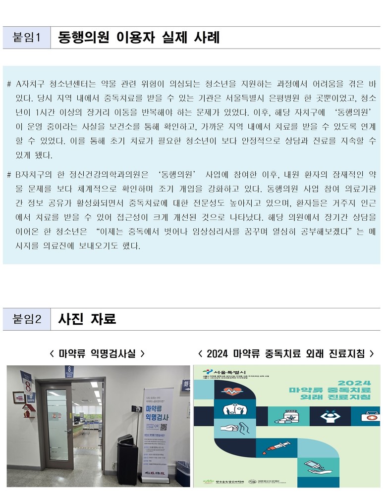 서울시는 청소년.청년층의 초기 마약류 중독치료를 강화하기 위해 정신건강의학과를 중심으로 ‘동행의원’을 지정, 현재 서울 시내 총 34개소를 운영 중이다. 치료는 환자가 동행의원으로 지정된 가까운 병원을 방문해 외래진료 받는 방식으로 이뤄진다.