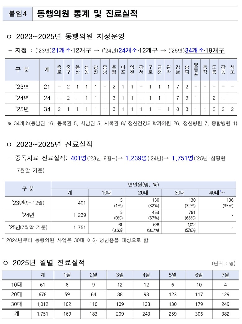 시는 최근 마약사범이 점차 늘고 있는 데다 온라인.비대면 구매가 확산되면서 청년뿐 아니라 청소년까지도 마약을 접하는 사례가 빠르게 증가하고 있어 동행의원을 단계적으로 확대해 왔다. 서울 마약류 사범은 '22년 4,640명→ '23년 6,271명→ '24년 5,623명으로 최근 3년간 연평균 5천 명을 넘어서고 있다.