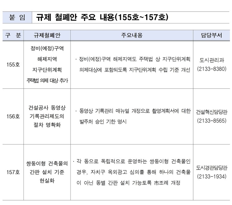 이번에 발표한 규제철폐안은 ▴(155호)정비(예정)구역 해제지역 지구단위계획 주택법 의제 대상 추가 ▴(156호)건설공사 동영상 기록관리제도의 절차 명확화 ▴(157호)쌍둥이형 건축물 간판 설치 기준 현실화 3건이다. 155호는 즉시, 156호는 내년 1월 중, 157호는 내년 중 시행 예정이다.