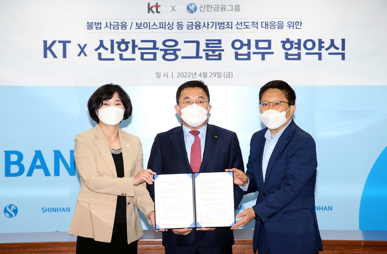 KT가 서울 중구의 신한금융 본사에서 신한금융그룹과 ‘불법 사금융 및 보이스피싱 등 금융사기범죄 탐지 및 예방 기술개발을 위한 MOU’를 체결했다고 1일 밝혔다.
