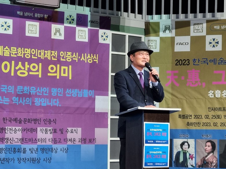 [세계타임즈 백진욱 기자] (사)한국예술문화단체총연합회(이하 한국예총)가 주최하고 한국예술문화명인진흥회(이하 명인진흥회)가 펼치는 2023 한국예술문화명인대제전 『흔적, 그리고 희망』의 축제가 지난 26일 인사동 소재 인사아트프라자 F4 갤러리와 B2 공연장에서 제 11회 명인인증식 & 그랜드마스터 발표회와 명인 예술 문화상 시상식이 펼쳐졌다.