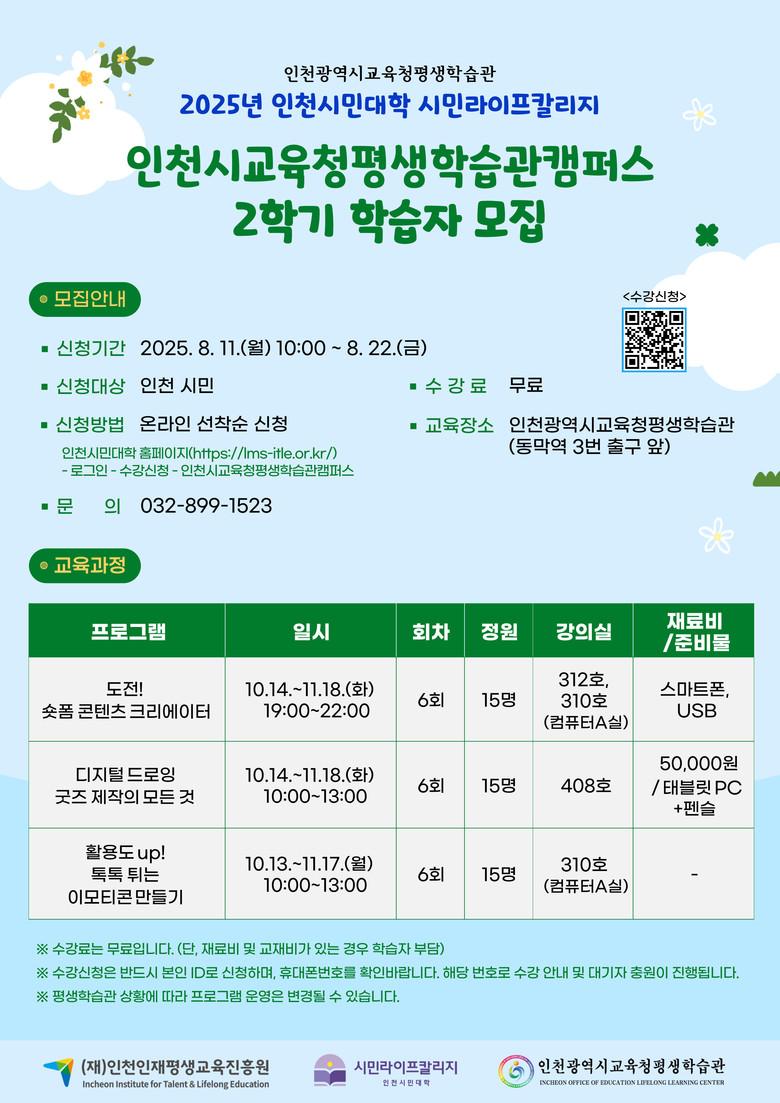 수강신청은 8월 11일(월) 오전 10시부터 인천시민대학 누리집(https://lms-itle.or.kr/)에서 선착순 진행하며, 전 과정 수강료는 무료(재료비 별도)다.