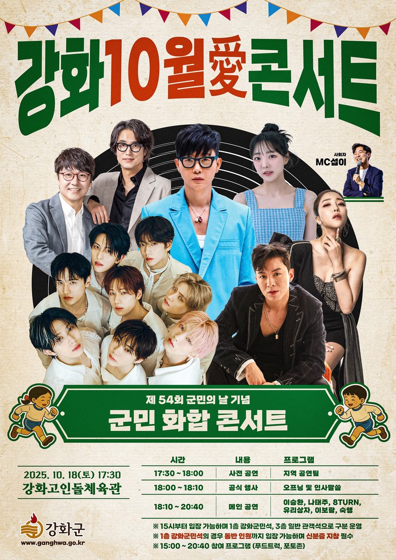 공연 관람 무료… 선착순 입장 [강화군 세계타임즈=심하린 기자] 강화군(군수 박용철)은 오는 10월 18일(토) 오후 5시 30분, 강화고인돌체육관에서 ‘2025 강화 10월애(愛) 콘서트’를 개최한다고 밝혔다.