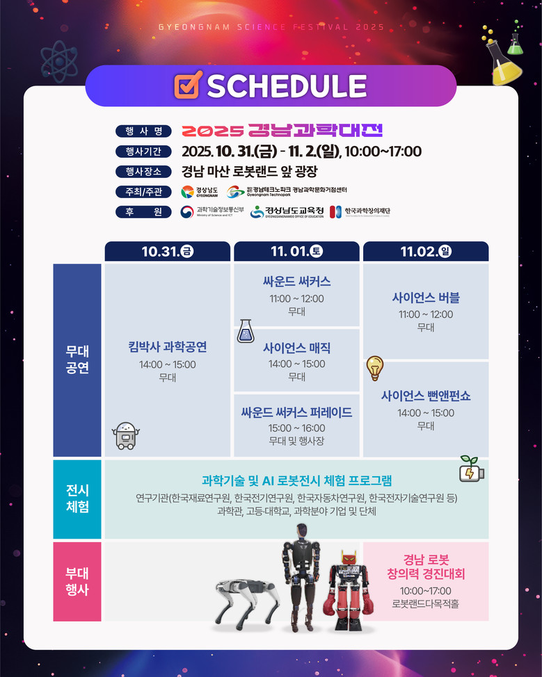 - AI․로봇존 등 50개 기관이 참여하는 5개 존에서 과학 관련 프로그램 전시 및 체험 [세계타임즈=경남 최성룡 기자] 경상남도(도지사 박완수)는 경남 최대 규모의 과학축제 <2025 경남과학대전>이 오는 31일부터 11월 2일까지 3일간 마산 로봇랜드 앞 광장에서 개최된다고 밝혔다.