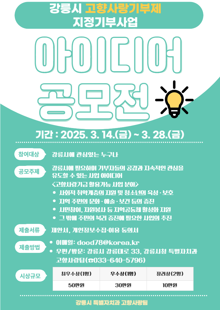 - 우수 제안자에게 총 100만 원의 시상금 지급 예정 - [강릉시 세계타임즈=김민석 기자] 강릉시는 14일(금)부터 오는 28일(금)까지 고향사랑기부제 지정기부사업 아이디어 공모를 진행한다고 밝혔다.
