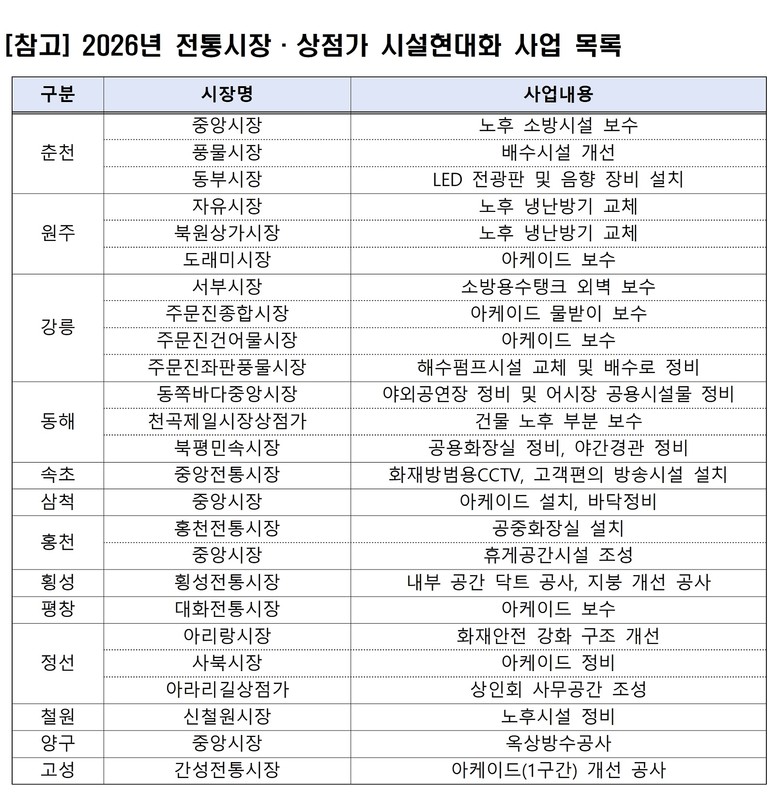 [강원도 세계타임즈=김민석 기자] 강원특별자치도는 2026년 도내 전통시장과 상점가의 경쟁력 강화와 활성화를 위해 총 129억 원을 투입해 시설 개선 사업을 추진한다. 이번 사업에는 주차환경개선사업 72억 원과 시설현대화사업 57억 원이 포함된다.