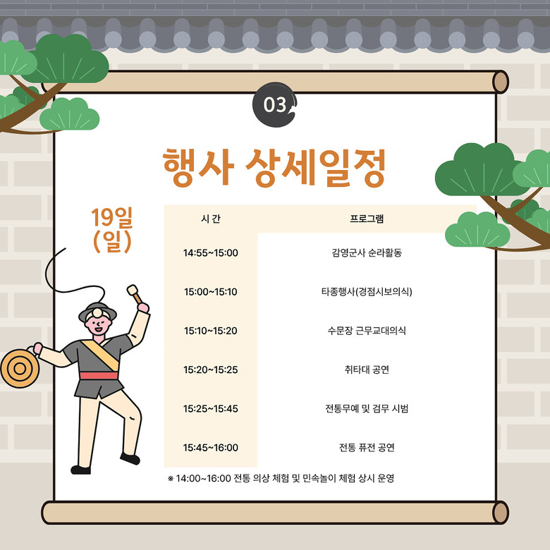 행사 기간 동안 매일 오후 3시부터 4시까지 다양한 전통 의식과 공연, 체험 프로그램이 펼쳐진다. 주요 프로그램은 ▲수문장 교대의식 ▲순라의식 ▲전통무예 시범 ▲취타대 공연 ▲타종 행사(경점시보) ▲어린이 향시 ▲축하공연 등이며, 전통의상 착용 체험과 민속놀이도 상시 운영한다.