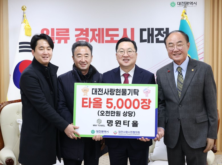 이날 기탁식에는 이장우 대전시장, 남재동 대전사랑시민협의회 회장, 석영일 명원타올 대표 등이 참석했다. 이번에 기탁된 물품은 대전 관내 취약계층(장애인, 독거노인 등)에 전달될 예정이다.