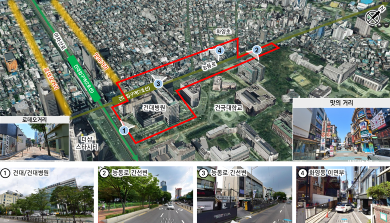 대상지는 지하철 환승역인 건대입구역을 포함하여 대중교통 이용이 편리하며, 주변에 건국대학교, 대학병원, 대규모점포 등이 입지한 지역이다. 또한, 이면부는 외식업, 패션잡화 중심의 저층 소규모 소매업이 밀집해 상권을 이루는 등 다양한 기능이 복합되어 있다.