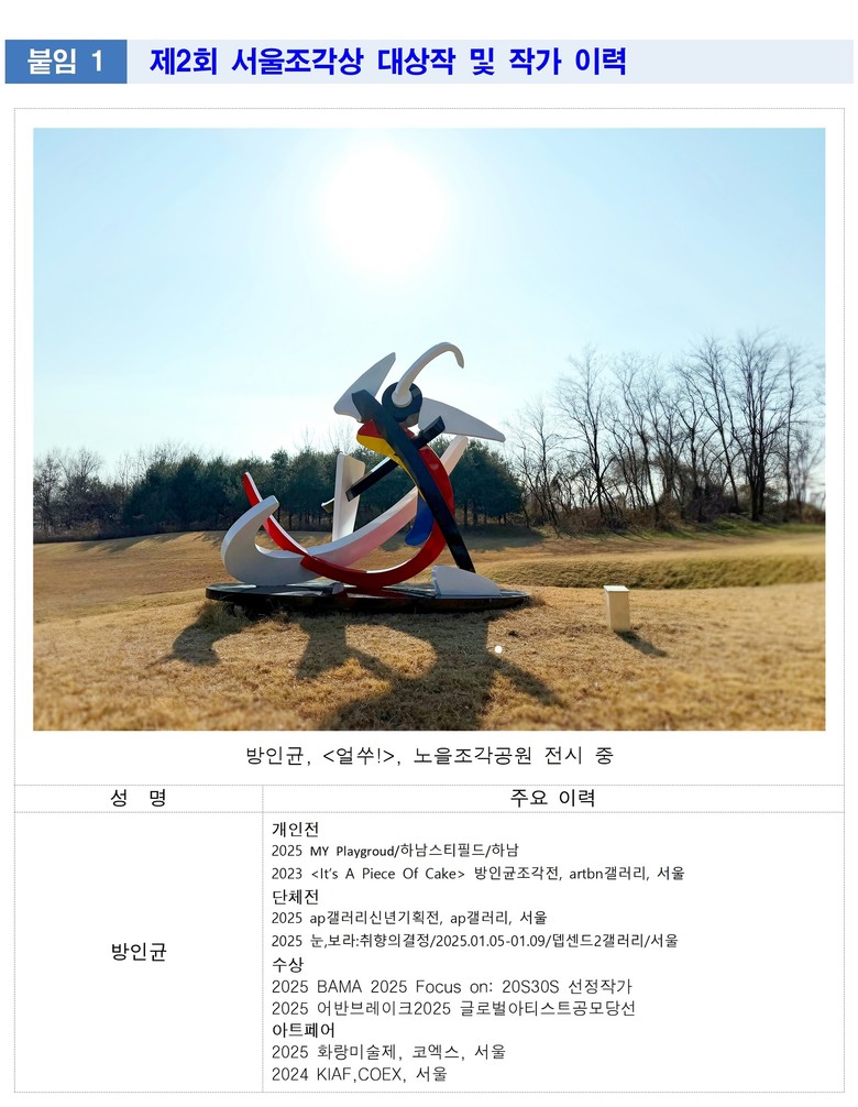 - 향후 3년간 노을공원에 전시…시민들에게 일상 속 희망과 긍정의 메시지 전달 [서울 세계타임즈=이장성 기자] 서울시는 제2회 서울조각상 공모 입선작 중 전문가 평가 및 시민투표를 통하여 대상작을 선정했다고 밝혔다. 9월 1일부터 11월 10일까지 투표를 통하여 시민들의 의견이 반영되었으며, 최종 선정된 대상작은 서울특별시장상이 수여될 예정이다.