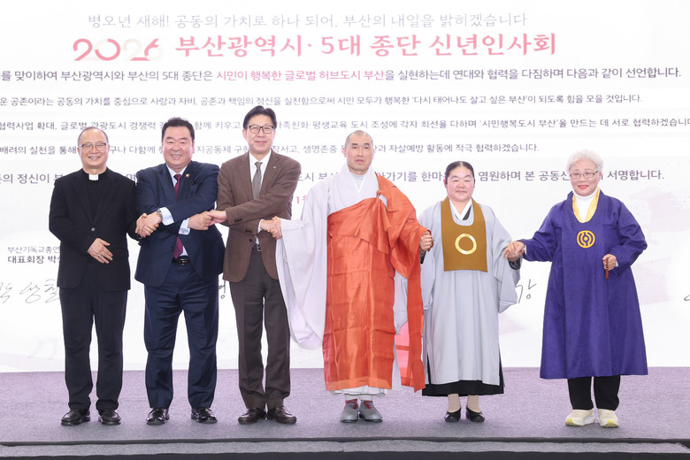 [세계타임즈=부산 이용우 기자] 부산시(시장 박형준)는 병오년 새해를 맞아 오늘(23일) 오후 3시 시의회 대회의실에서 지역 5대 종단과 함께 시민의 평안과 행복을 기원하는 「5대 종단 신년 인사회」를 개최한다고 밝혔다.