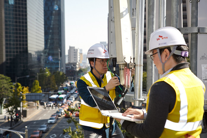 SK텔레콤은 지난달 28일 서울 을지로 일대에서 세계 최초로 LTE, 5G 통신 기지국 및 주파수 연동망을 구축하고, LTE-5G 통신망을 넘나들며 통신데이터를 전송하는 시연을 했다.