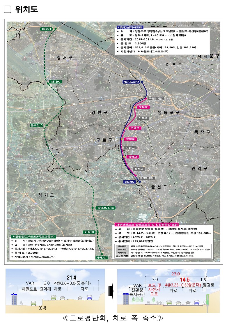 ‘서부간선도로 일반도로화 및 친환경공간 조성공사’는 서부간선 지하도로 및 광명-서울 고속도로와 연계하여 서부간선 상부도로의 구조·기능을 개편하기 위해 단절된 안양천과의 접근성 개선을 통해 수변 친화도시를 조성하고, 일반도로화로 차로폭 축소, 녹지공간 확보 등 친환경 주민 편의공간을 조성하는 것이 목적이다.