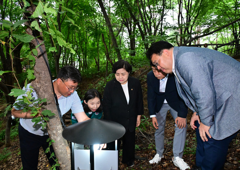 [서울 세계타임즈=이장성 기자] 최호정 서울특별시의회 의장은 27일(금) 은평구 백련산 등산로 입구에서 시범사업 중인 러브버그 친환경 포집 현장을 방문했다.