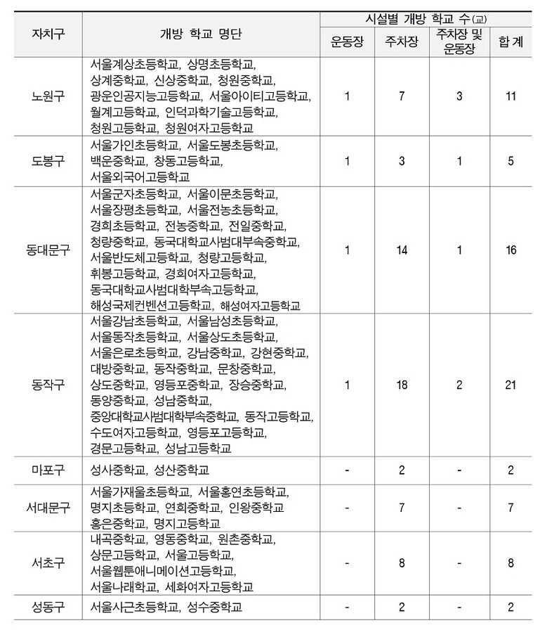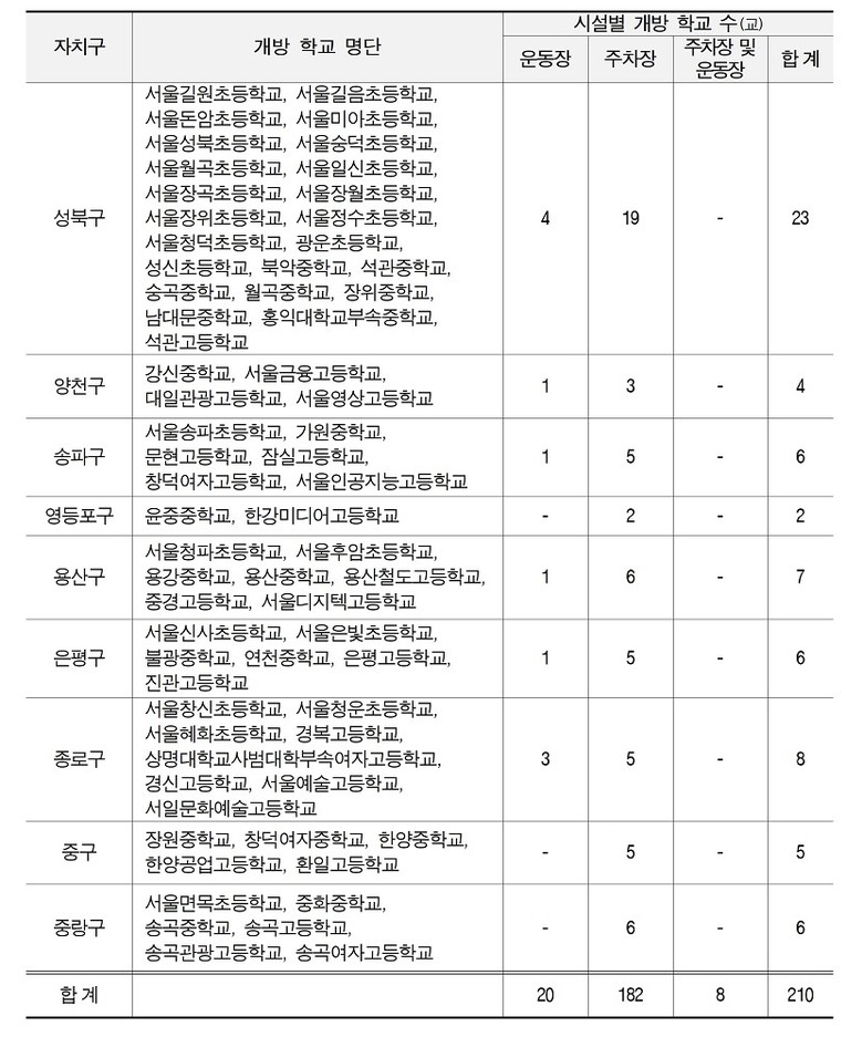 이번 설 연휴기간 주차공간을 개방하는 학교는 서울특별시교육청 관내 공·사립 각급학교 총 210교이다.