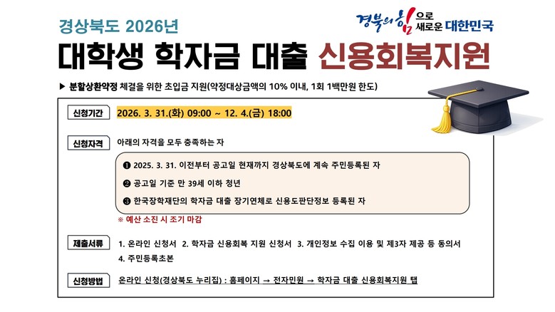 [세계타임즈=경북 한윤석 기자] 경북도가 도내 학자금 대출을 받은 대학생과 학자금 대출 장기 연체로 신용도 판단 정보에 등록된 사람을 대상으로 이자 지원 구간과 회복지원 범위를 확대해 경제적 부담 완화에 나선다.