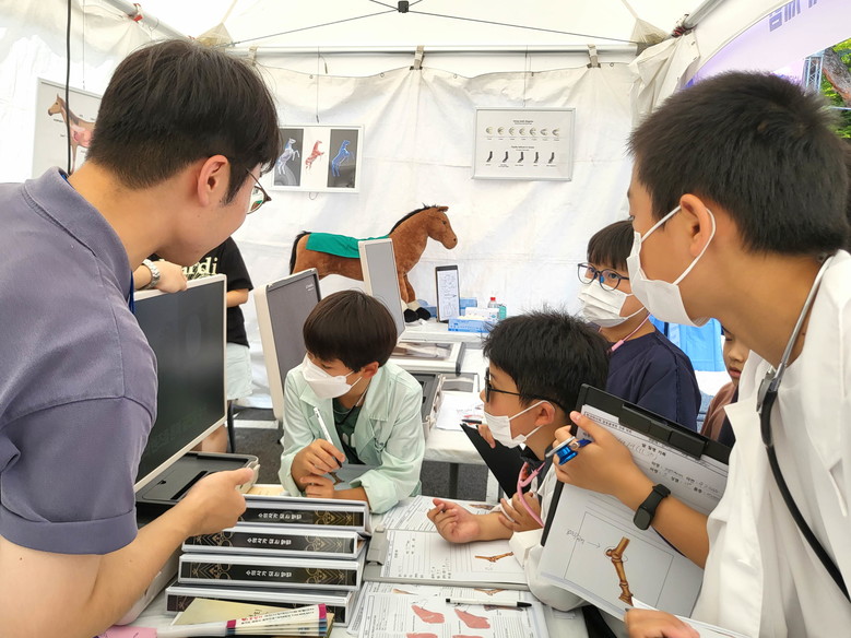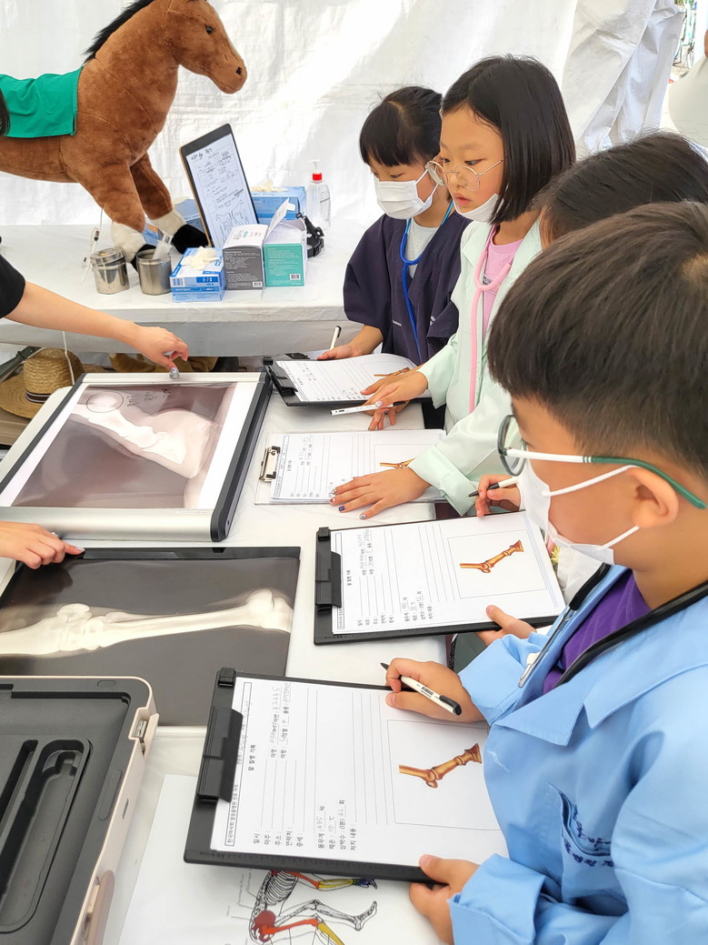 먼저 ‘말 건강을 더해~, 말 동물병원 체험’ 행사는 유치원부터 초등학교 저학년 대상의 프로그램이다. 현장에서 QR코드로 예약할 수 있으며 회당 10명씩 30분간 진행된다. 아이들은 수의사 가운, 청진기 등 장비를 착용하고 말 전문 수의사로 변신해 붕대감기, 심장박동 측정, 진료차트 작성 및 말 상식 OX퀴즈 등을 체험하게 된다.