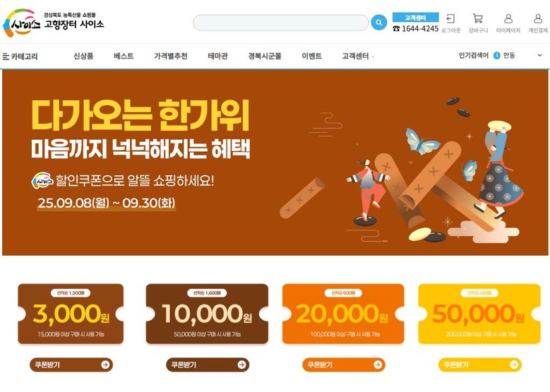 - 추석 선물은 사이소가 딱! 할인은 물론 최대 5만원 쿠폰까지 - [세계타임즈=경북 한윤석 기자] 경상북도는 온라인 농특산물 쇼핑몰 ‘경북 고향장터 사이소’에서 추석을 맞아 30일까지 추석 선물 기획전을 운영한다.