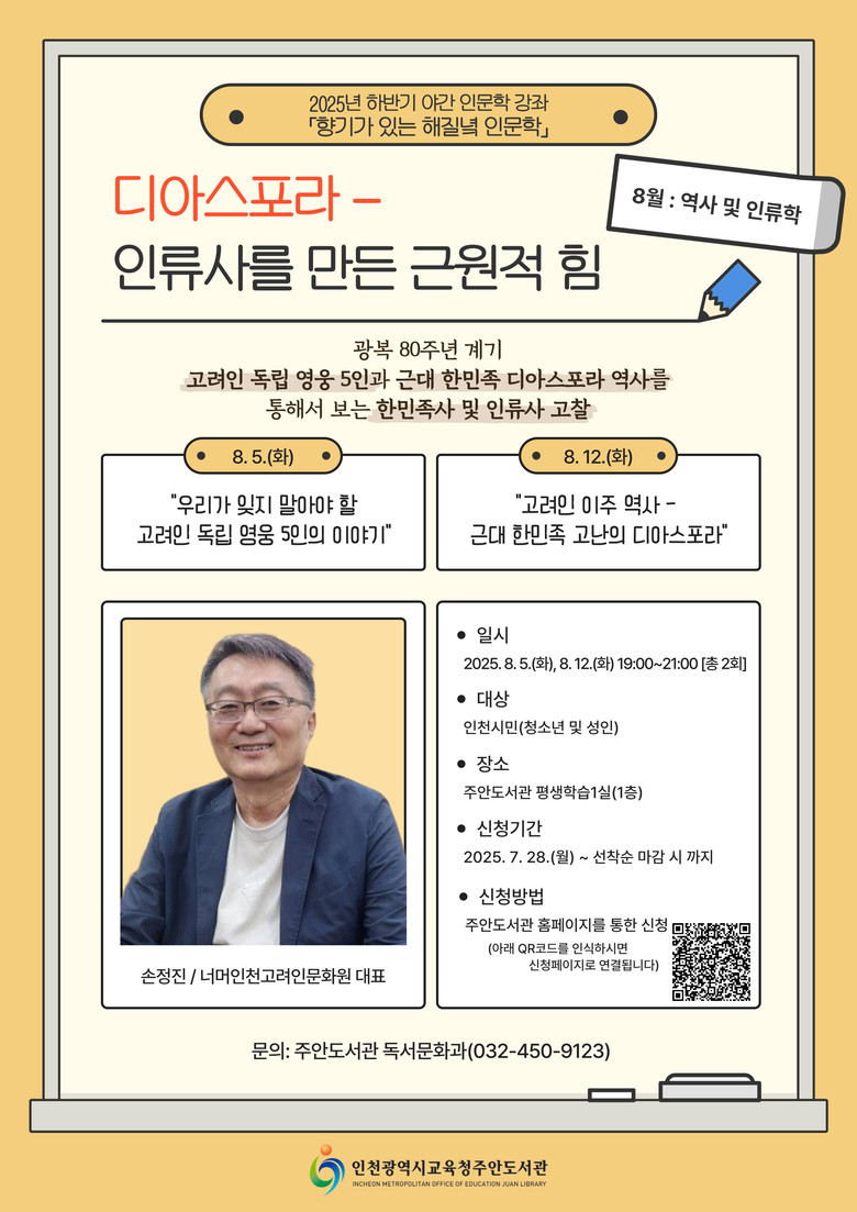 이번 강연은 ‘역사 및 인류사’을 주제로 인천 거주 고려인의 정착과 지원에 앞장서고 있는 손정진 ‘너머인천고려인문화원’ 대표가 진행한다.