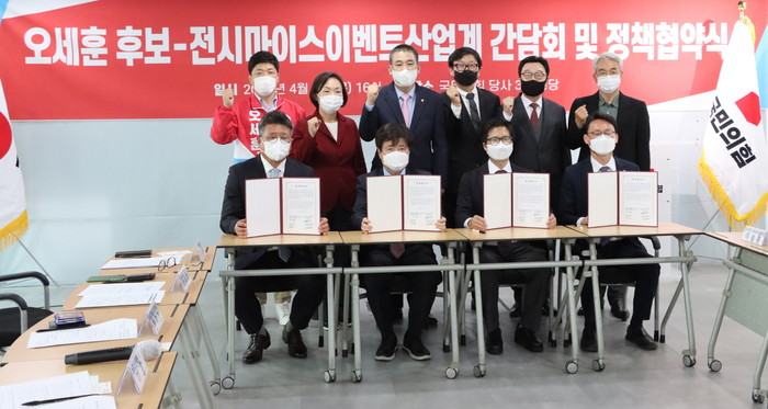협약식에는 오세훈 후보 총괄선대본부장을 맡은 유경준 의원과 이승훈 한국전시주최자협회장, 김한석 한국이벤트산업협동조합 이사장, 하홍국 한국MICE협회 사무총장이 참석해 서명했다.
