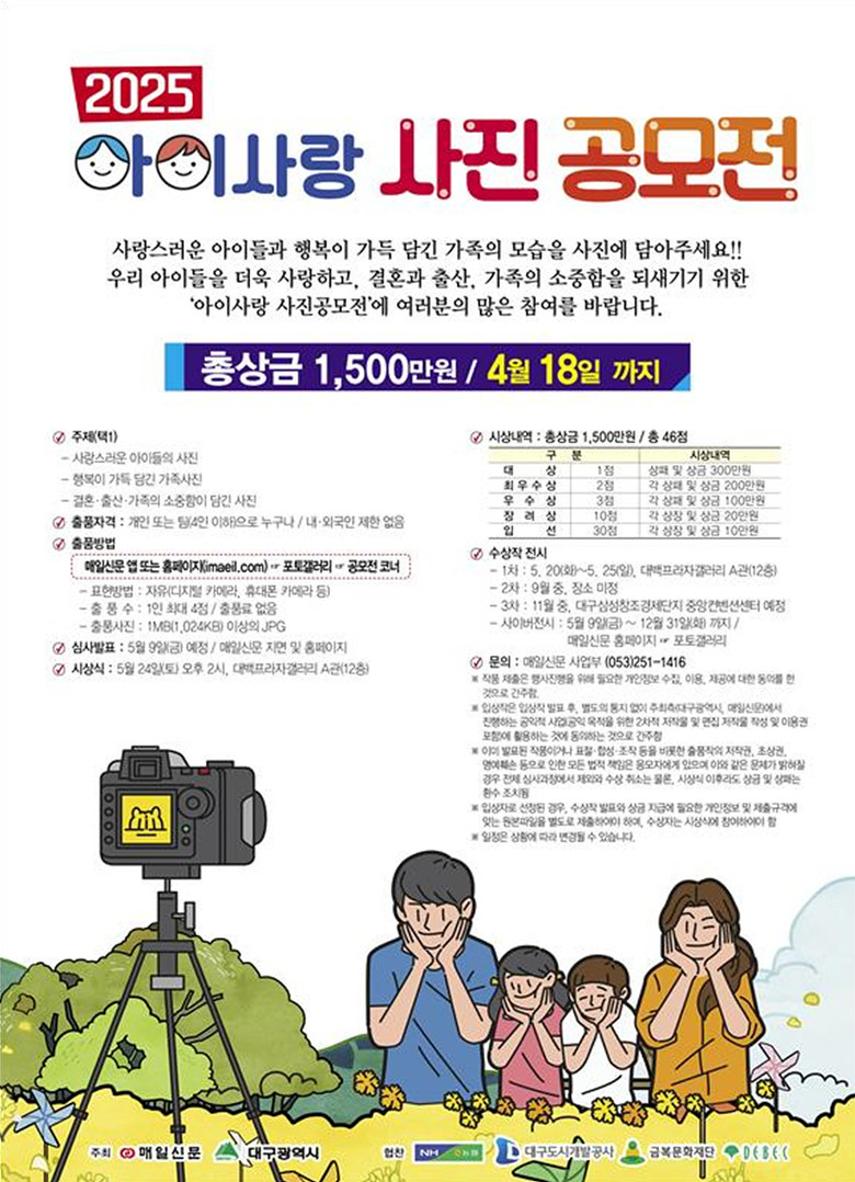 ▸ 결혼·출산에 대한 긍정적 인식을 제고하는 다양한 작품 기대 [대구 세계타임즈=한윤석 기자] 대구광역시는 오는 3월 10일(월)부터 4월 18일(금)까지 ‘2025 아이사랑 사진 공모전’을 개최한다.