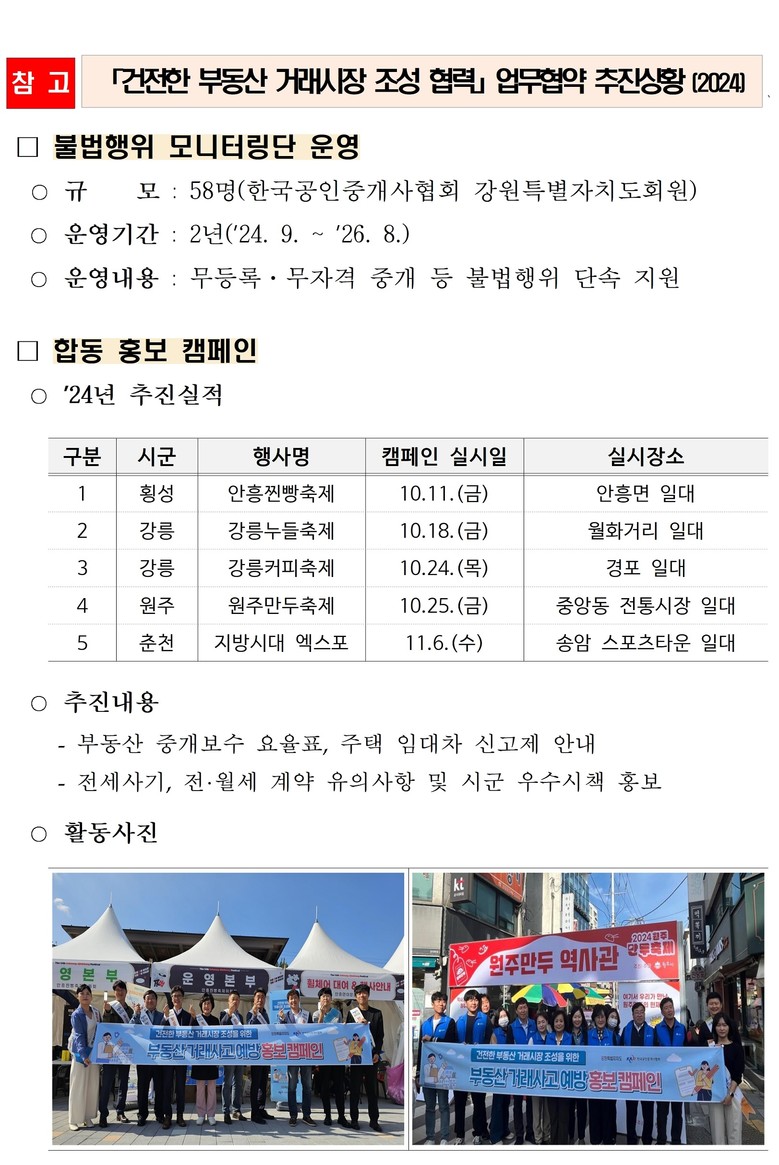 또한, 시군 및 한국공인중개사협회 강원특별자치도회(회장 신선미)와 협력해 부동산 거래사고 예방 홍보 캠페인을 전개하고, 공인중개사 무료 상담실을 확대 운영하여 도민이 직접 체감할 수 있는 행정 서비스를 제공할 예정이다.