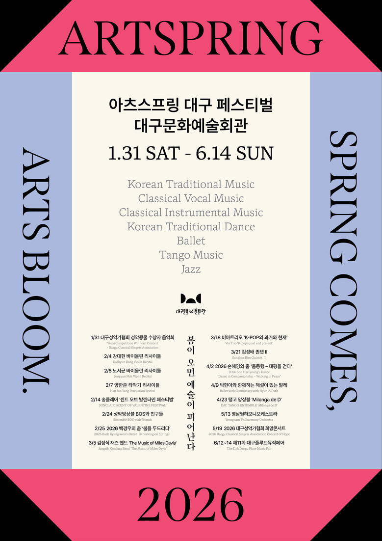 ▸ 신진 연주가부터 대구 예술의 토대를 닦은 지역예술단체들까지 총망라 [세계타임즈=대구 한윤석 기자] 대구문화예술회관(관장 김희철)은 대구를 기반으로 활동하는 지역 예술인들의 공연을 한데 모아 그들의 예술혼을 집중 조명하는 축제 <2026 아츠스프링 대구 페스티벌>의 16개 공연을 오는 1월 31일(토)부터 6월 14일(일)까지 대구문화예술회관에서 개최한다고 밝혔다.