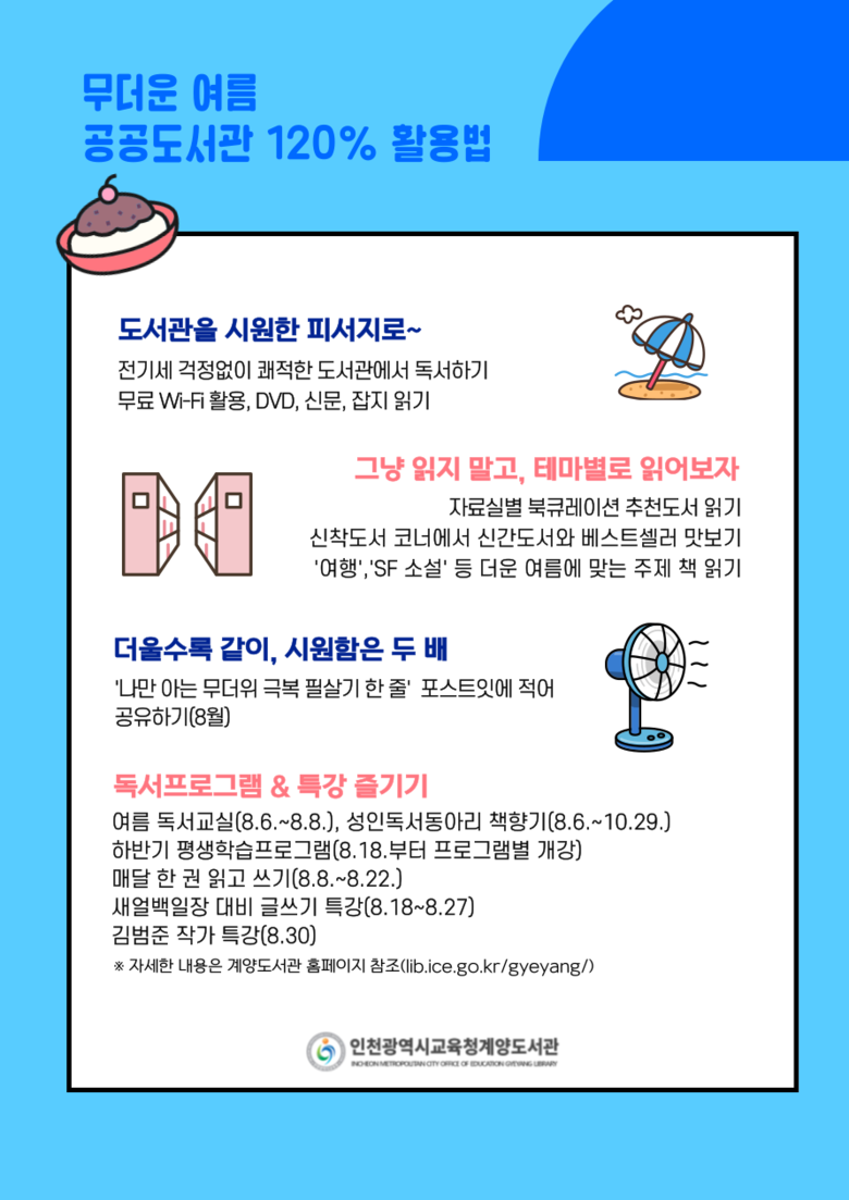 이번 캠페인은 ‘무더운 여름, 공공도서관 120% 활용법’을 주제로, 시민들이 더위 속에서도 쾌적하게 독서와 문화 활동을 즐기고, 냉방비 절감과 기후 위기 대응에 동참하도록 기획했다.