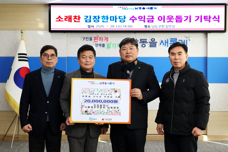 [남동구 세계타임즈=심하린 기자] 인천시 남동구는 최근 (사)인천식품제조연합 남동구협회로부터 ‘2025년 남동구 소래찬 김장한마당’ 판매 수익금 총 2천만 원을 기탁받았다고 30일 밝혔다.