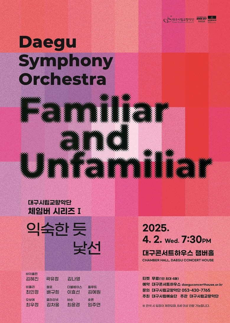 □ 대구시향 ‘체임버 시리즈 I : 익숙한 듯 낯선’은 전석 무료이며, 1인 최대 4매까지 대구콘서트하우스 홈페이지나 전화(053-430-7765)로 예약할 수 있다.